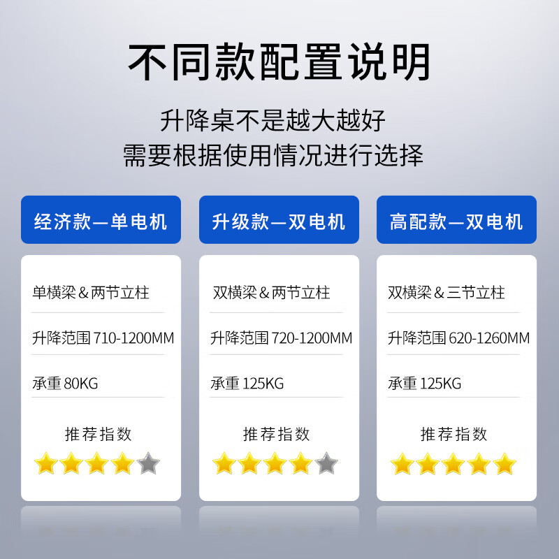 ? ? ? ? 單電機作為經濟實惠款,升降立柱外管采用兩節,升降行程71-117這個范圍左右,且考慮到單電機的承重能力,平衡力,相對升降范圍會適當降低一些;單電機電動升降桌都是經過嚴格檢測,合格出廠的;