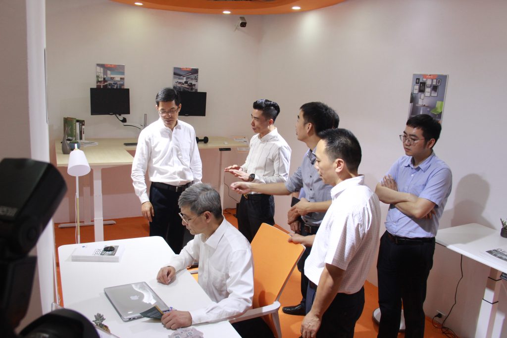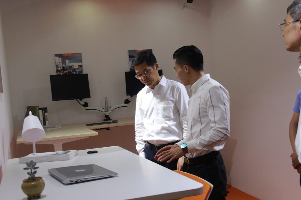 ? ? ? 丁部長一行在耐特驅動董事長王建鋒的陪同下,詳細了解了耐特自主創新研發的NT33系列智能升降桌,并現場體驗了產品。NT33系列智能升降桌,能夠幫助辦公人群告別久坐,實現站、坐、動交替辦公,保護腰椎和頸椎,保持良好的體型。同時站立辦公還能更好的激發靈感讓文化工作更高效。